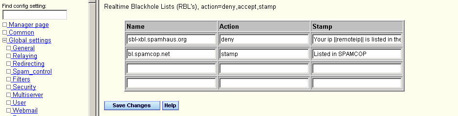 g_orbs_list name="zen.spamhaus.org" action="deny" stamp="Your ip is listed in the spamhaus RBL http://www.spamhaus.org" g_orbs_list name="bl.spamcop.net" action="stamp" stamp="Listed in SPAMCOP"